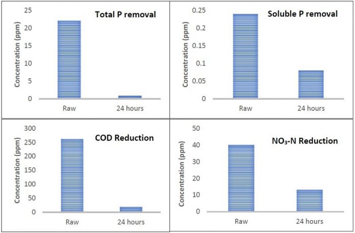 After 1 hour of settling time, the total phosphate removal was more than 90%. When the samples were allowed to settle for 24 hours, a further 42% was removed from the remaining total phosphate concentrations. The overall removal rate of soluble phosphate over the 24 hours was approximately 80%. A reduction in Chemical Oxygen Demand (COD) was also noticed during the 24 hours, measuring approximately 76%. A reduction in nitrate content (NO3-N) was also observed with some change in ammonium concentrations (NH4-N) over the same period.