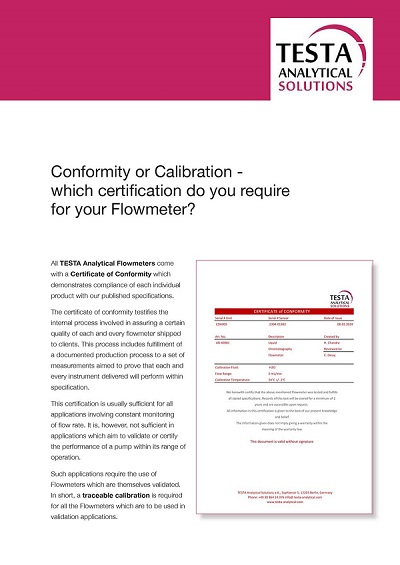 For labs looking to validate or certify the performance of a pump within its range of operation this requires the use of flowmeters which are themselves validated. For this TESTA Analytical offers a traceable calibration service for its range of flowmeters. Traceable to known reference or standard, each Certificate of Calibration certifies that a 10-point calibration protocol has been undertaken covering the full range of operation for a supplied flowmeter.