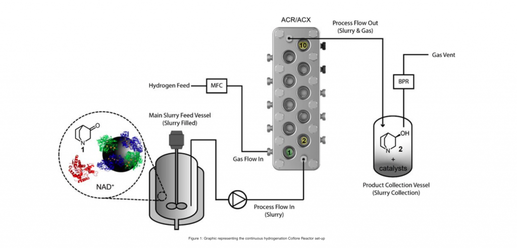 The team of scientists involved in this project have developed a new method for converting ketones to (3R)-quinuclidinol using a biocatalytic hydrogenation process used in continuous flow reactors.
