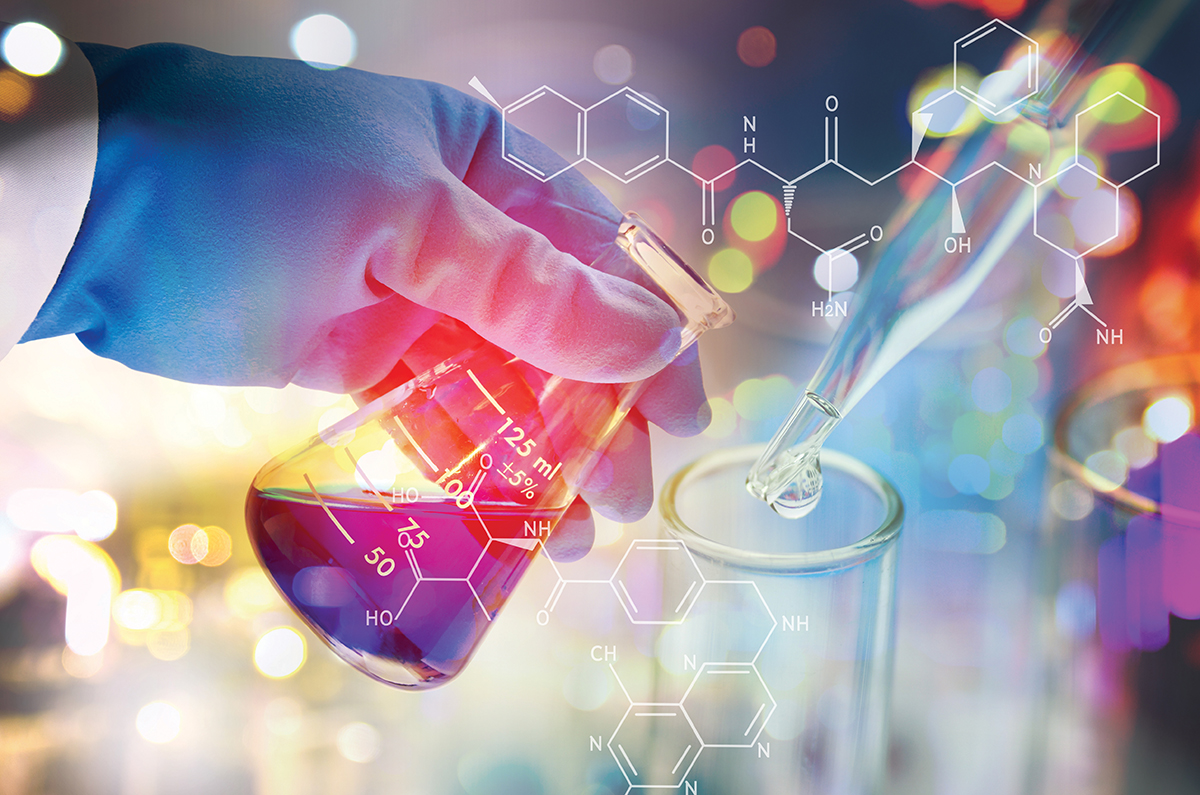 close up of scientist with test tubes and funnel