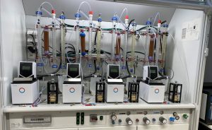 In this example, basic research is being conducted on electrolysis cells. More precisely, PEM electrolysis cells are tested to produce hydrogen. PEM stands for Proton Exchange Membrane, which describes the solid polymer electrolyte of the cell. While an 8-channel booth is currently being planned and even a 40-channel booth is envisaged in the long term, a 4-channel booth is shown here. This means that four cells are tested simultaneously to generate reliable process data on current density distribution, dynamic operating behavior, and gas purity, and to evaluate these later.