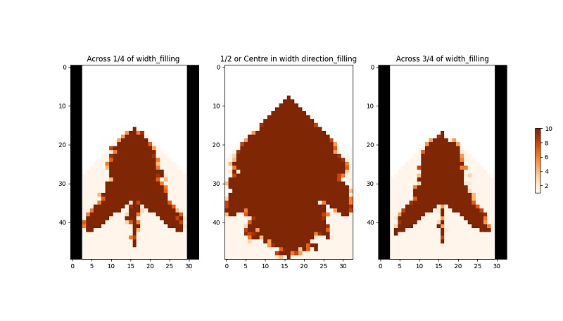 the cross sections of a silo are shown in Fig 1. Dark brown areas in figures show higher fines accumulation compared to the light brown areas. Cells with very pale brown colour are coarse materials.
