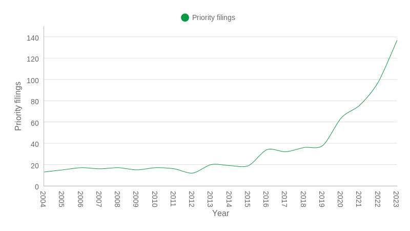 However, from 2019-2023, filings increased by 260% – reaching a new high of nearly 150 new applications in a single year – likely driven by decarbonisation policies such as the US Inflation Reduction Act, Japan’s Green Growth Strategy and the EU’s Carbon Border Adjustment Mechanism.