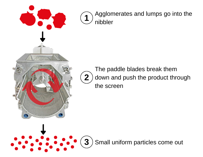 If you imagine an industrial grade cheese grater, with large powerful rotating paddle blades breaking the product down through a steel screen, then you have a Nibbler.