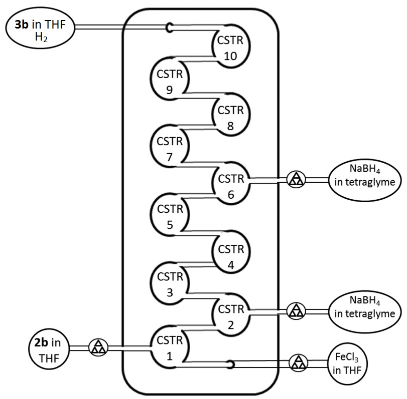 This work involves successful handling of a 23.5% w/v slurry solution within the Coflore® ACR. The image above shows how the team at Apotex set up their Coflore® ACR cell block. The versatility of the Coflore® ACR allows for multiple injection sites (three each per CSTR 1&10, two each per CSTR 2-9). This allowed the researchers to add sodium borohydride at both cells 2 and 6 for example.