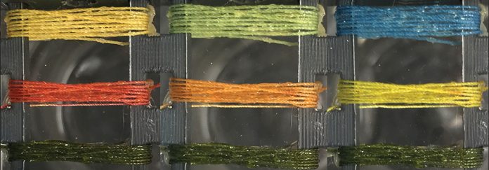 The study used a manganese-based dye, MnTPP, methyl red, and bromothymol blue to prove the concept. MnTPP and bromothymol blue can detect ammonia while methyl red can detect hydrogen chloride – gases commonly released from cleaning supplies, fertilizer and chemical and materials production. A three-step process “traps” the dye in the thread. The thread is first dipped in the dye, then treated with acetic acid, which makes the surface coarser and swells the fiber, possibly allowing more binding interactions between the dye and tread. Finally, the thread is treated with polydimethylsiloxane (PDMS), which creates a flexible, physical seal around the thread and dye, which also repels water and prevents dye from leaching during washing. Importantly, the PDMS is also gas permeable, allowing the analytes to reach the optical dyes.