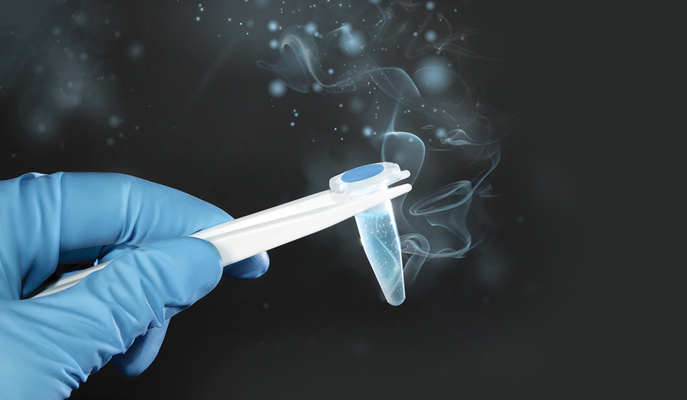 Thawing cryosample taken out of cryostorage on dark green background, text space