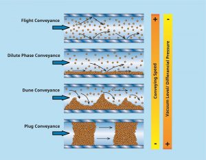 In order to be able to select the most effective method of vacuum generation, it is vital to be very familiar with the operating conditions of the vacuum conveying system and to apply this knowledge when selecting the vacuum pump. These parameters are of crucial importance in order to select the most suitable one from various principles for vacuum generation. On the one hand, the conveyed material and its properties must be known. Additional influential parameters are pipe routing, length and diameter as well as the type of conveying (fig. 1). These parameters can be used to determine the required differential pressure (∆p). The differential pressure and the volume flow are the main influential parameters for the technical selection of the vacuum pump or vacuum system. For the economic efficiency calculation, operating costs must be considered in addition to acquisition costs. This includes the energy consumption, possibly further acquisition costs for throttle regulation, valves or control depending on the vacuum generation, the operating time (e.g. continuous operation, batch operation) as well as the maintenance effort and costs.